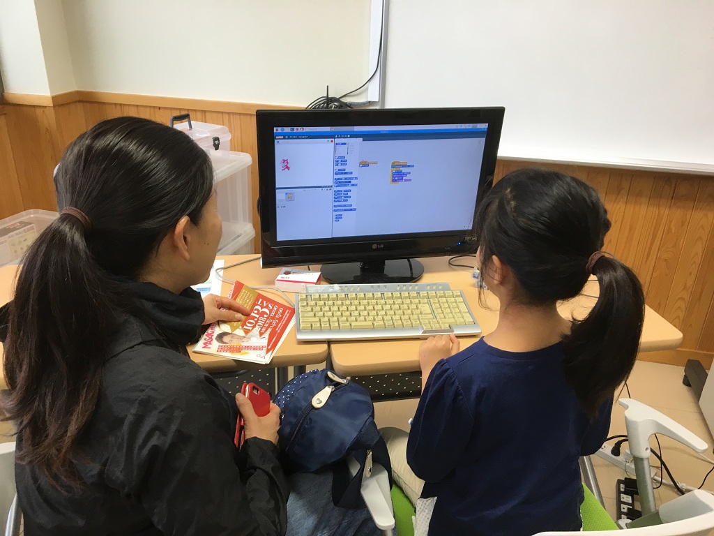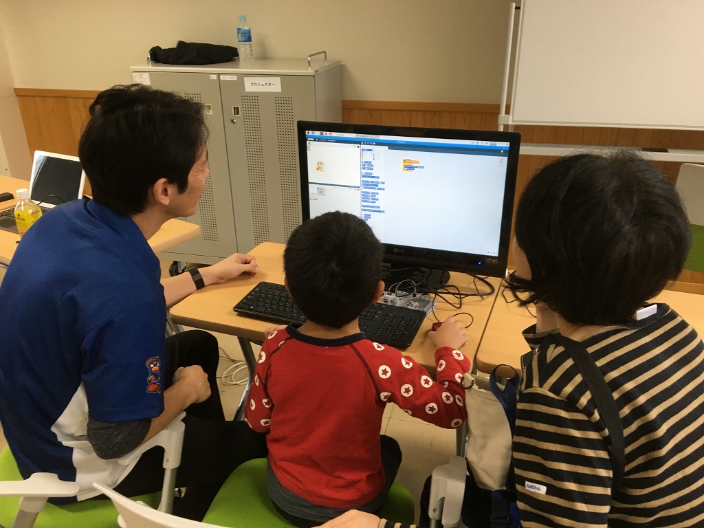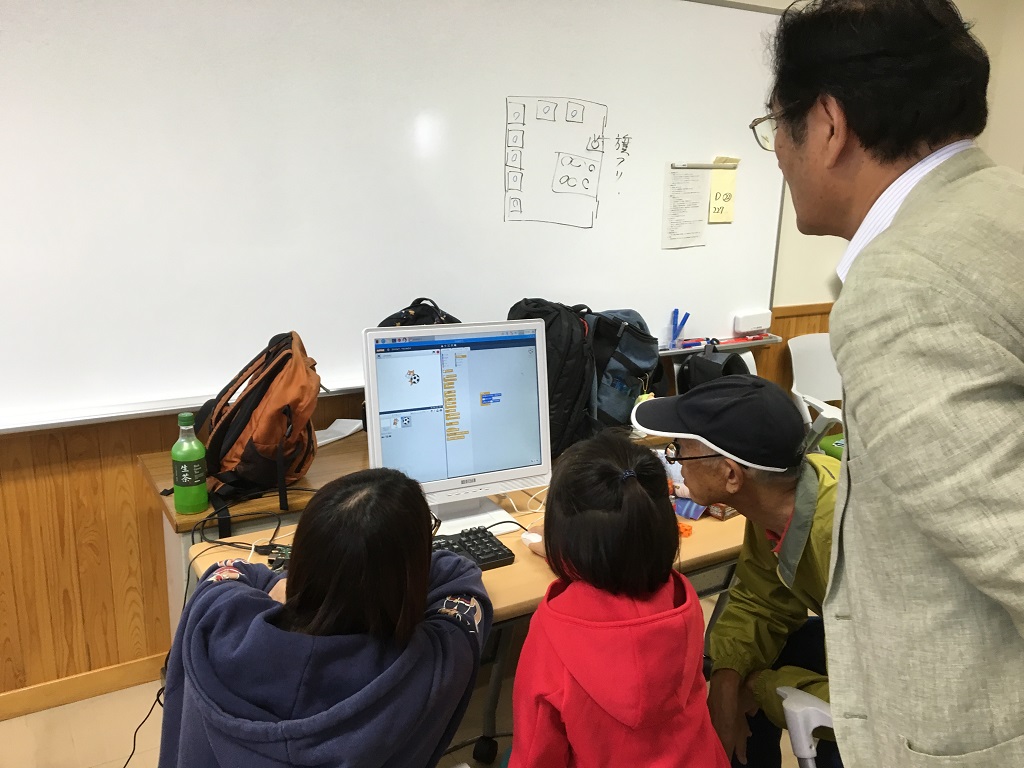 協賛展示としてのスクラッチプログラミング教室。227室にて。
