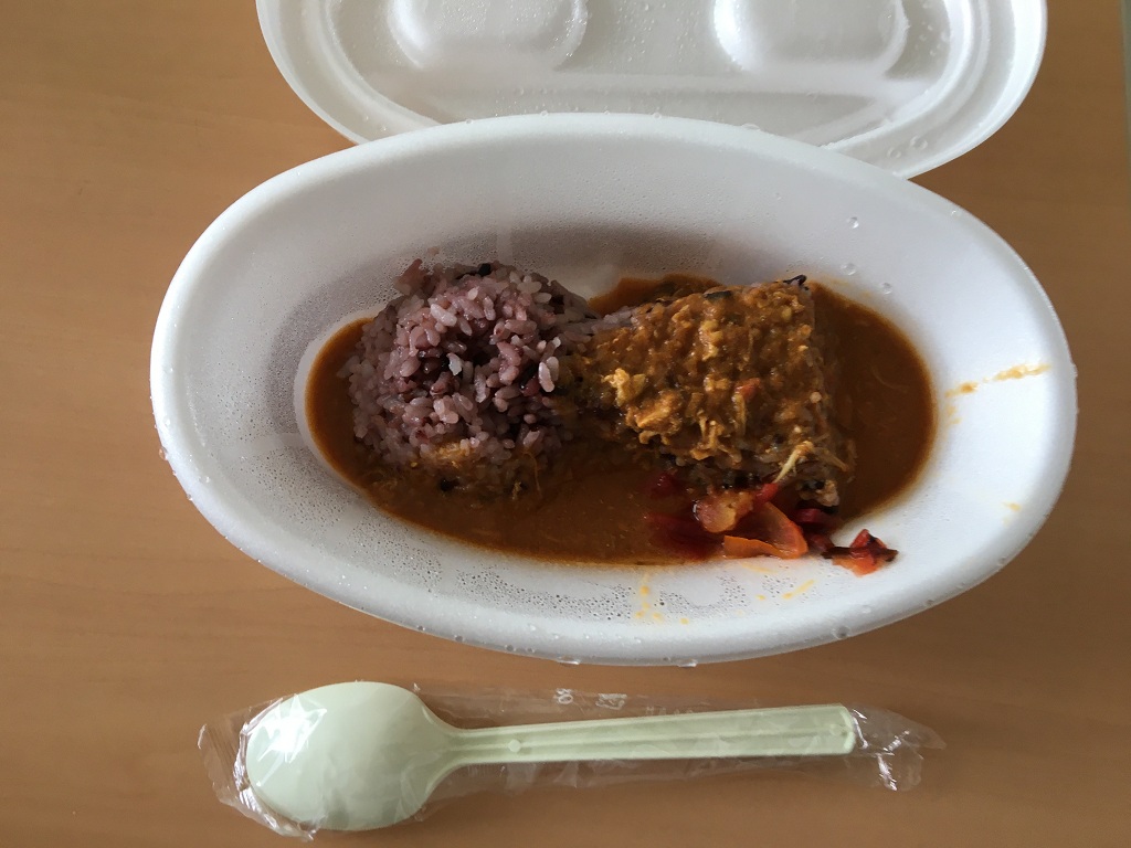 午前中の3つの教室を終えて昼食。古代米のカレー。