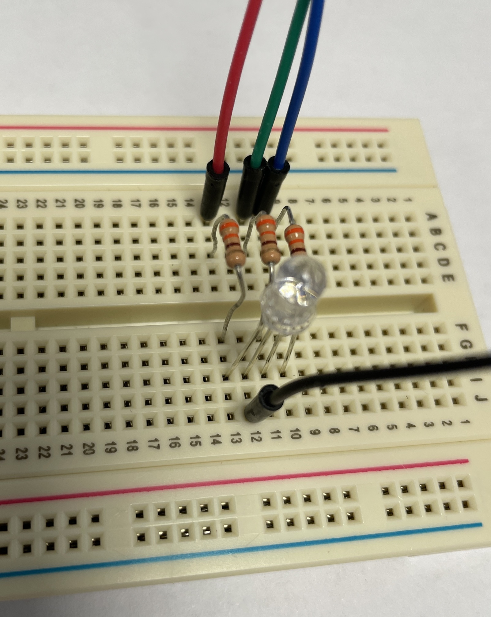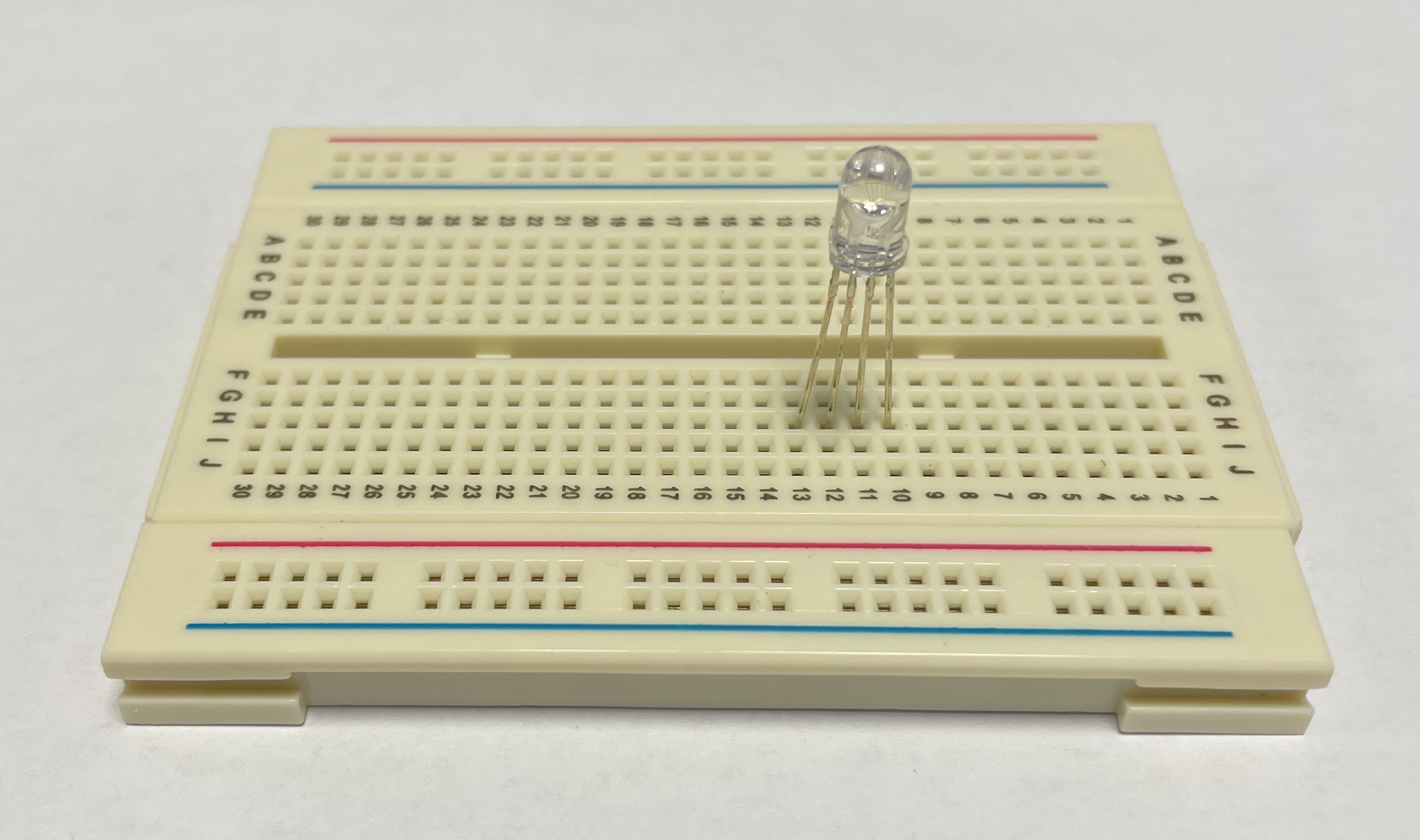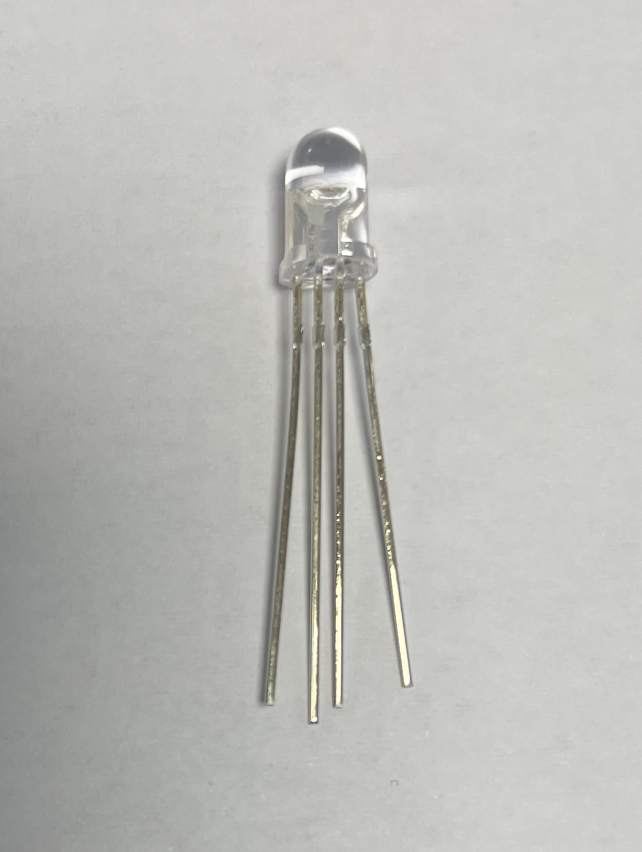 フルカラーLED。向かって左から、赤(R)、グランド(接地、GND)、緑(G)、青(B)。