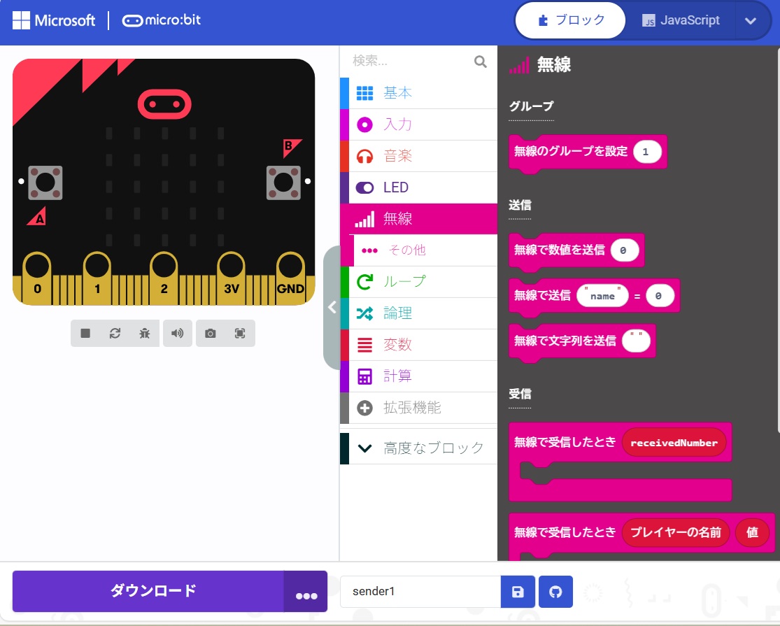 ダウンロードして、MakeCodeで読み込み、ブロックに切り替える。