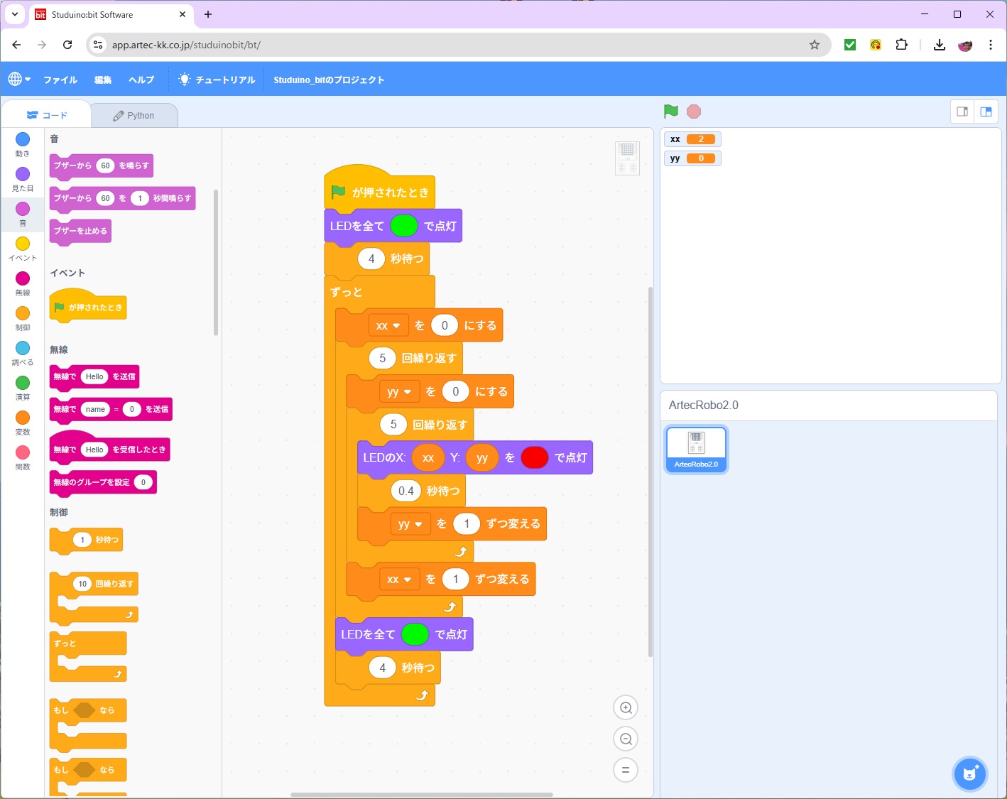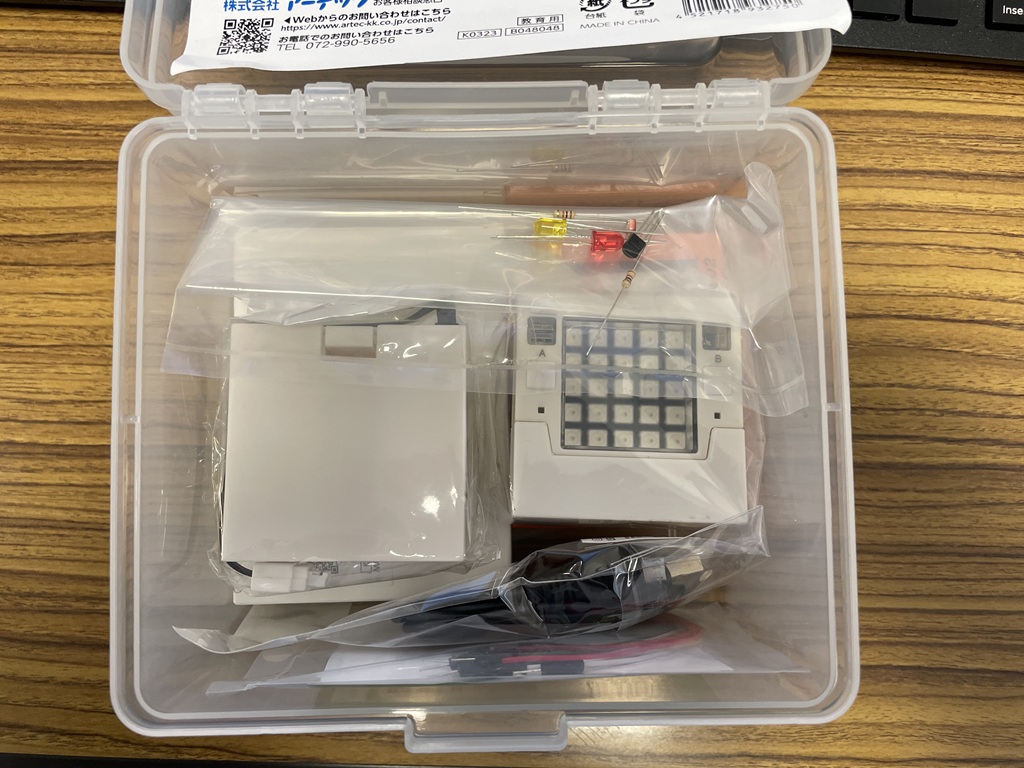 2026年 2月 5日(木) Studuino:bit到着、プログラミング。 Studuino:bit。 Studuino:bitの内容物。 起動。 LEDの点灯プログラム。 pythonプログラムのスクリプト LEDの点灯プログラム。(動画33秒) 戻る
