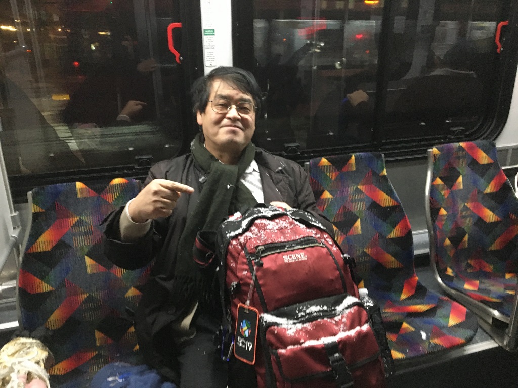 In the car of the free bus to the Union Station, Denver