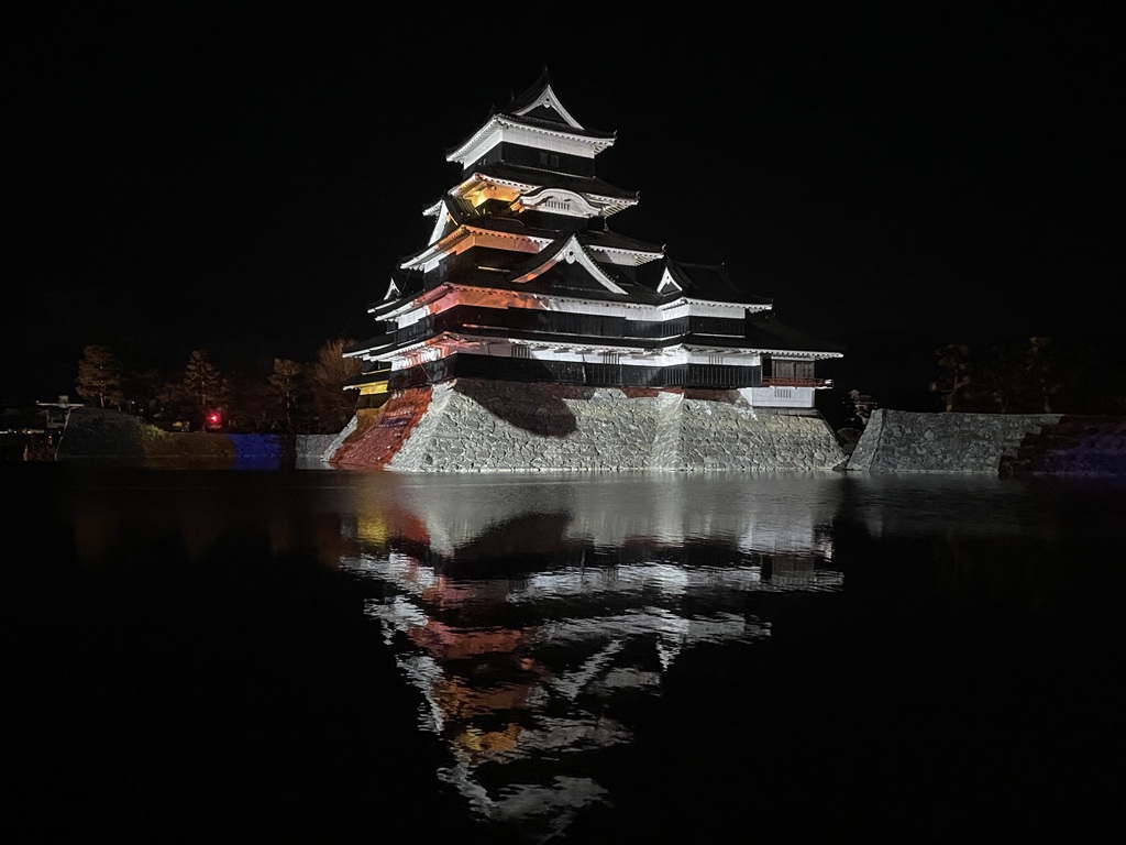 松本までバスで移動。松本城のプロジェクションマッピング。